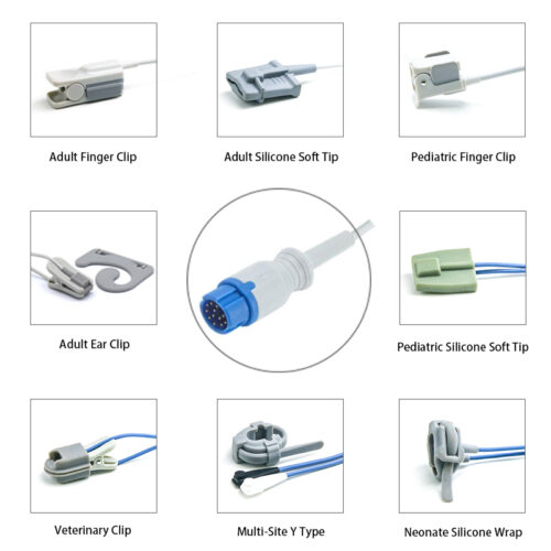 These are SpO2 sensors reusable with 12 pin male connector, high-quality, durable, designed to provide reliable and accurate blood oxygen saturation (SpO2) and pulse rate monitoring, which are suitable for patients like adult, pediatric, neonates.