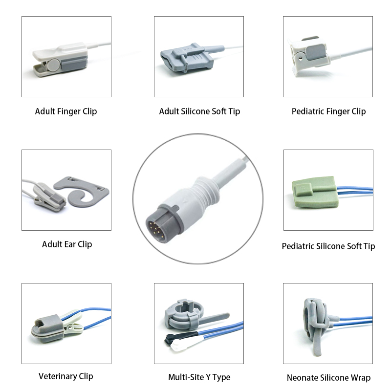 These are SpO2 sensors reusable with 8 pin male connector, high-quality, durable, designed to provide reliable and accurate blood oxygen saturation (SpO2) and pulse rate monitoring, which are suitable for patients like adult, pediatric, neonates.
